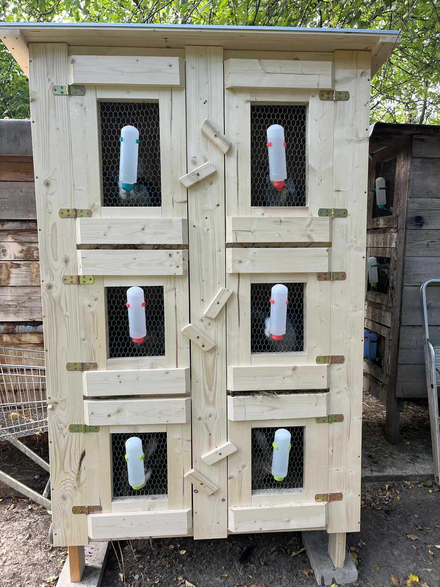 Konštrukcia: Konštrukcia králikárne je jednoduchá, ale zároveň pevná. Steny sú samonosné, všetky spoje skrutkované (nie klincované), krtické miesta na zárubni a ráme dverí sú podlepené. Zaručuje jednoduché používanie počas dlhej doby.