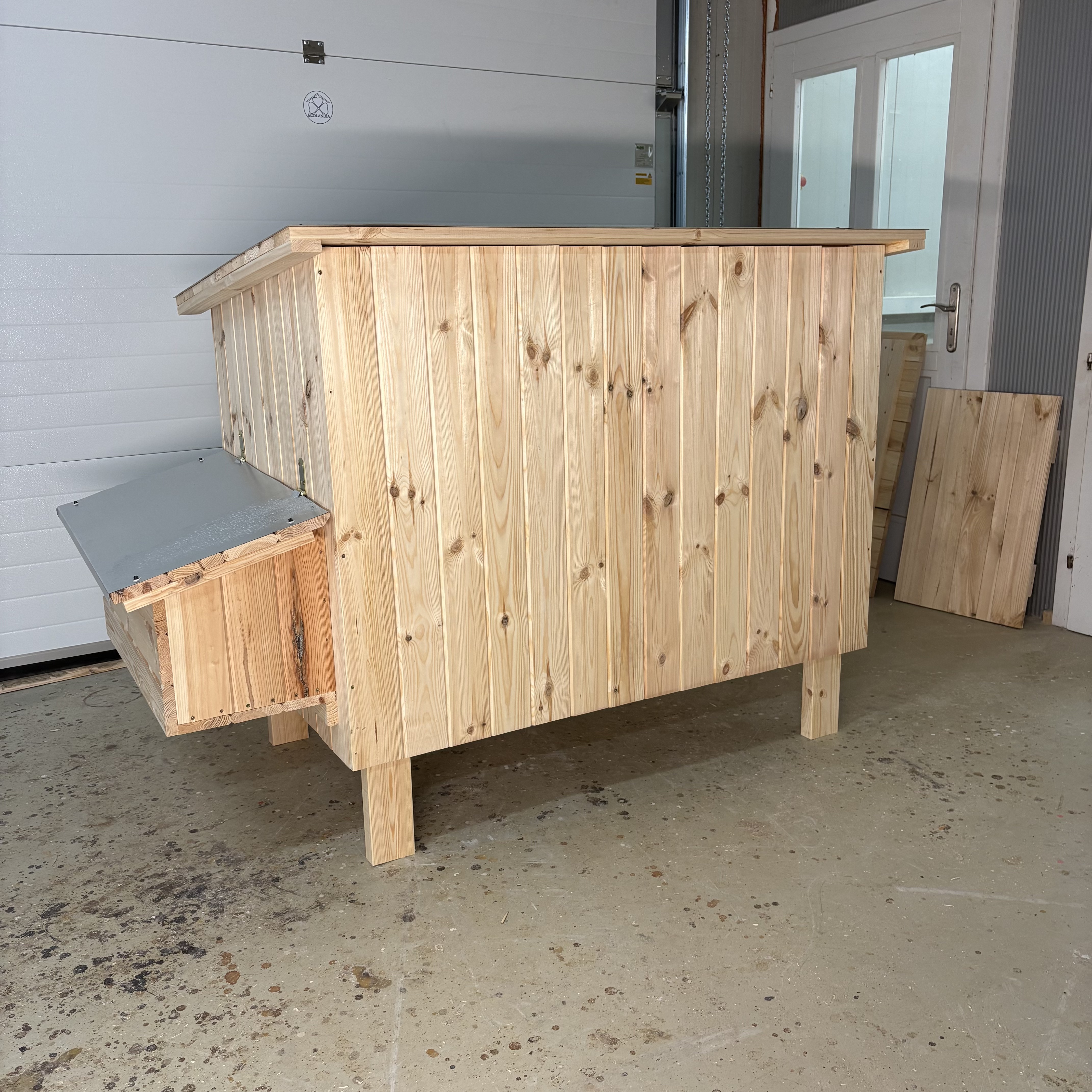Konštrukcia je navrhnutá s dôrazom na maximálnu pevnosť a dlhú životnosť. Kurník stojí na masívnych nohách, čo chráni sliepky pred zemnou vlhkosťou a predátormi, pričom zároveň uľahčuje čistenie. Vonkajšie znáškové hniezdo umožňuje pohodlný zber vajíčok bez nutnosti vchádzať dovnútra. Bočné dvere s masívnym pántom a drevenou petlicou zabezpečujú ľahký prístup k čisteniu interiéru. Všetky spoje sú skrutkované, tie najviac namáhané aj podlepené.