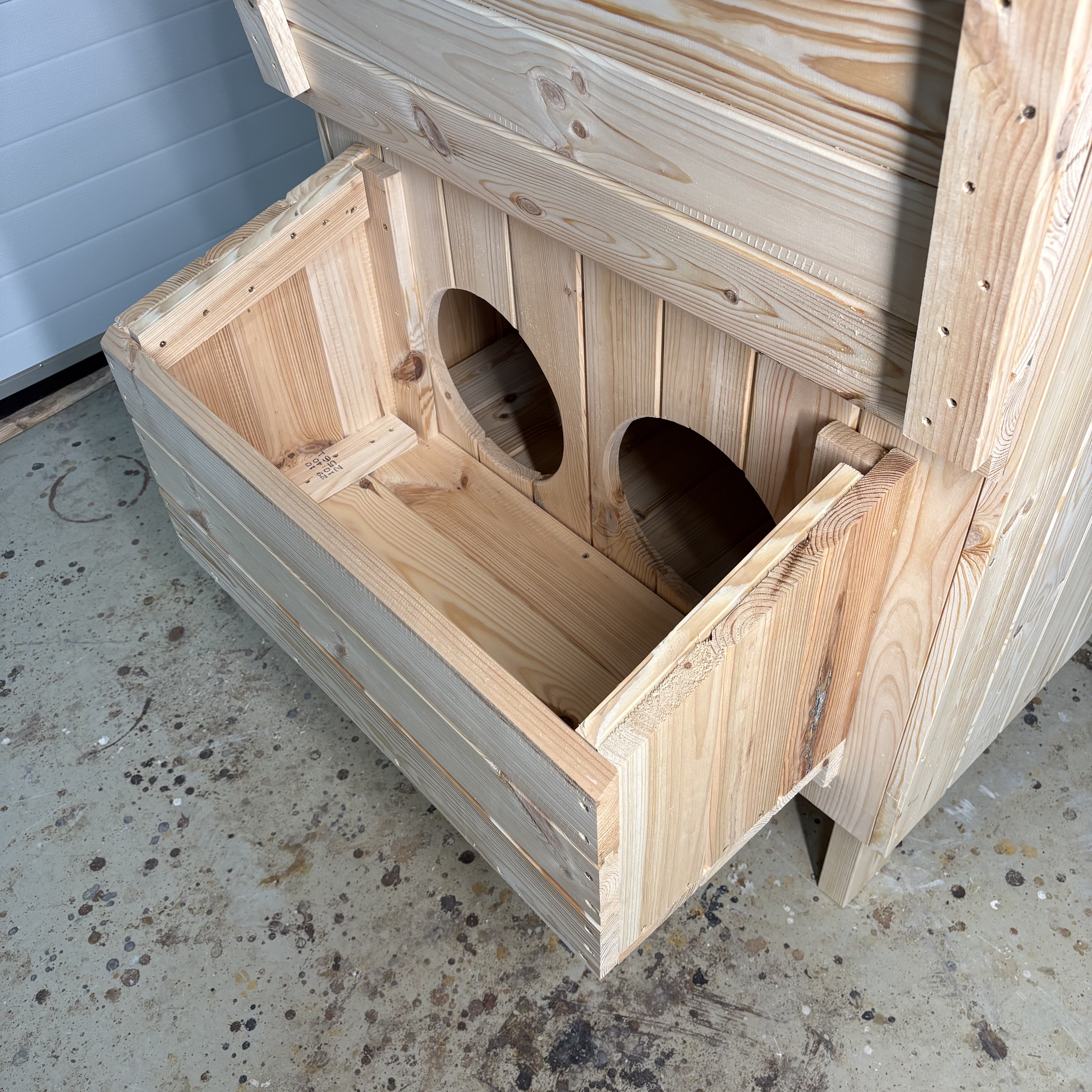 Vybavenie: 2× vnútorný otvor do znáškového hniezda, vyvýšený spánkový rošt (bidlo), prístupová rampa.